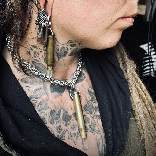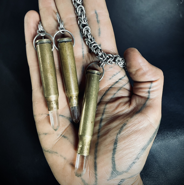 Parure cristal de roche montée sur de vielles cartouches de munitions en laiton.